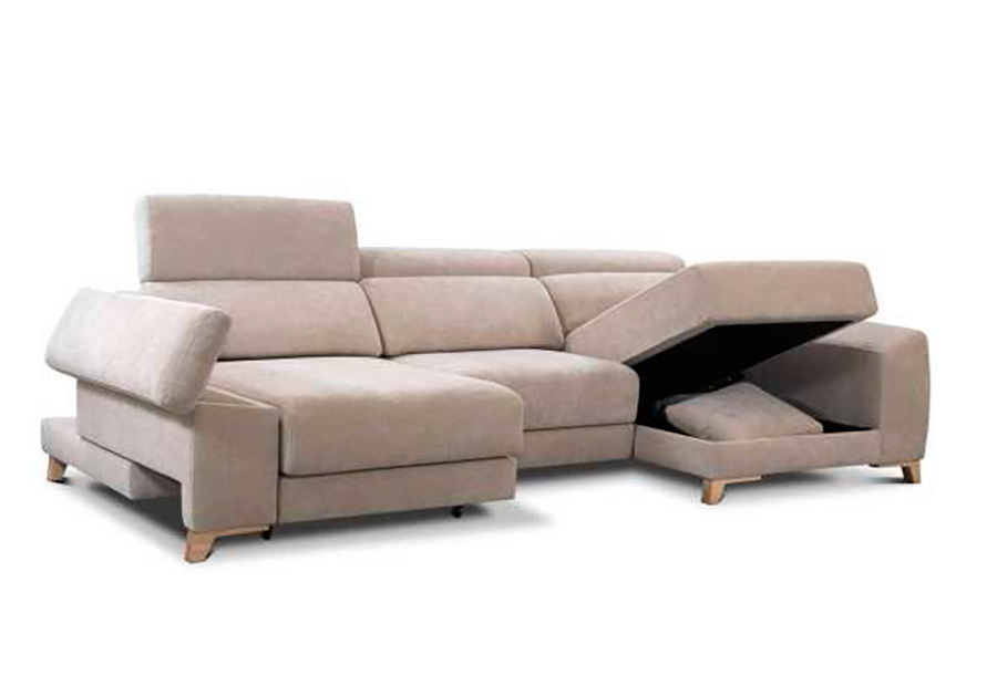 2 cojines de decoración en chaiselongue. Brazo módulo deslizante y con arcón, patas de madera natural (10cm), chaiselongue con arcón.
